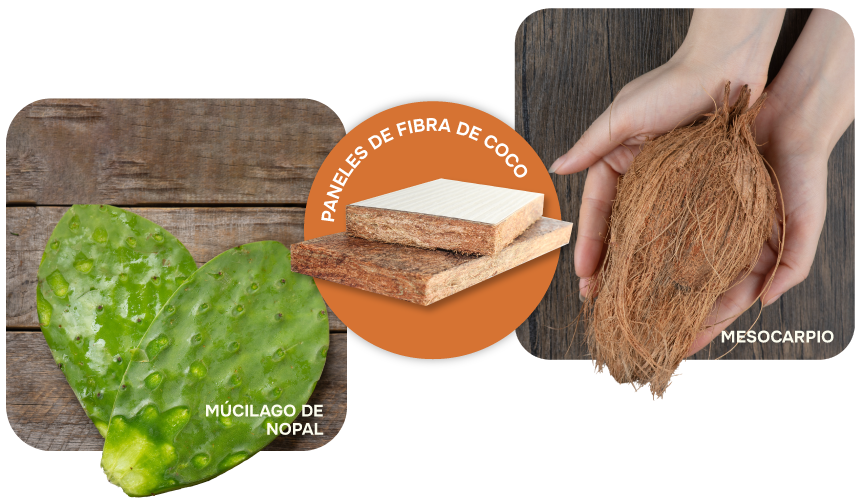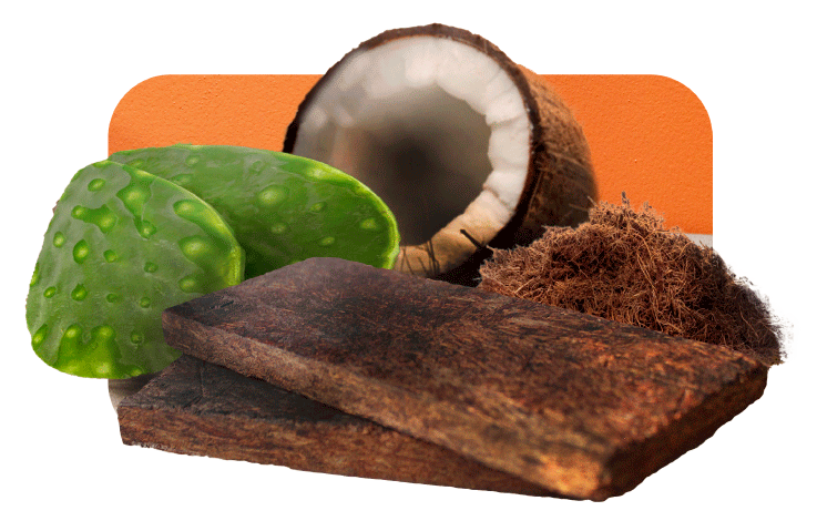 La fibra de coco o mesocarpio de coco es un sustrato obtenido de la extración de la copra que mezclado con el mucilago de nopal, como materia prima principal, se obtine el CWM